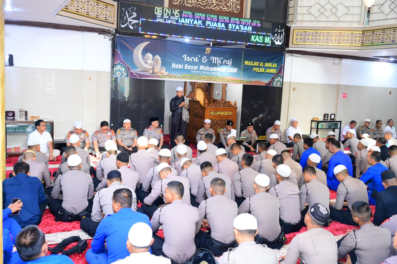 “Sesungguhnya sudah menjadi ketetapan Allah SWT menjadikan kita sebagai orang-orang terpilih yang dapat hadir dan mengikuti kegiatan Isra’ dan Mi’raj di Masjid Al-Ikhlas Polda Jambi,” ujar Brigjen Pol. M. Mustaqim.