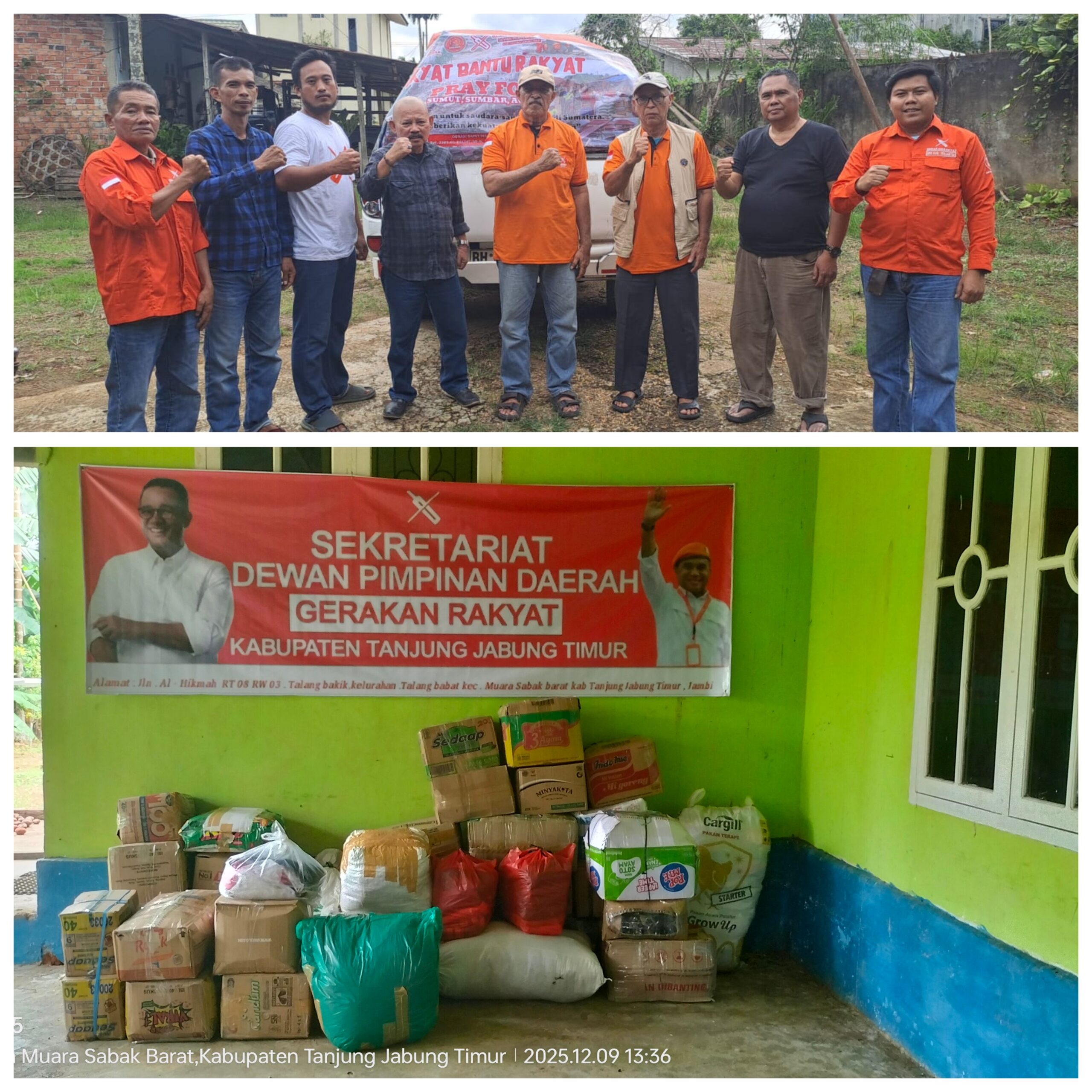 Tanjab Timur, KNJ.com – Dewan Pengurus Daerah Gerakan Rakyat (DPD GR) Kabupaten Tanjung Jabung Timur menyerahkan bantuan Longsor dan Banjir Bandang di Sumatra Barat, Sumatra Utara dan Aceh melalui Dewan Pengurus Wilayah Gerakan Rakyat (DPW GR) Propinsi Jambi berupa Pakaian Layak pakai dan uang tunai penyerahan bantuan tersebut dilaksakan satu pintu atas himbauan Dewan Pengurus Pusat Gerakan Rakyat (DPP GR) penyerahan dilakukan Ketua DPD Gerakan Rakyat Tanjung Jabung Timur ke DPW Gerakan Rakyat Propinsi Jambi,.di Sekretariat DPD GR Tanjab Timur, Kamis (9/11/25)