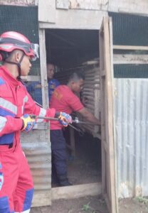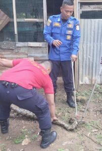 Tanjab Timur, KNJ. Com – Petugas pemadam kebakaran (Damkar) Dinas Pol PP /Damkar Kabupaten Tanjung Jabung Timur mengevakuasi seekor ular piton sepanjang 2 meter dari kandang ayam milik warga.rwptil tersebut masih ada dalam bok kandang ayam warga tersebut.