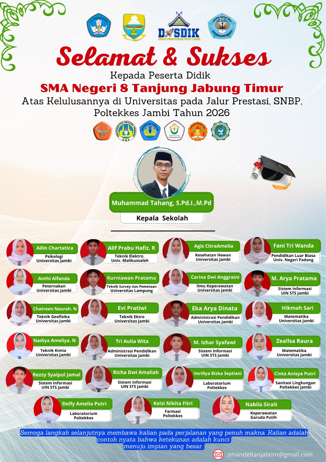 Tidak hanya itu, keberhasilan ini juga menunjukkan kualitas pendidikan di SMAN 8 Tanjab Timur yang terus meningkat dari tahun ke tahun. Sekolah berkomitmen untuk terus mencetak lulusan yang unggul, berkarakter, dan siap menghadapi tantangan masa depan.