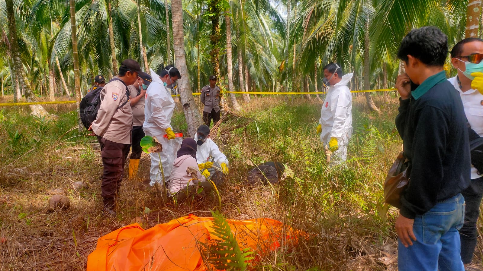 Saat ditemukan, posisi korban terlungkup. Kondisi tubuh sudah membusuk dan di tangan korban masih tergenggam sebilah golok. Polisi memastikan korban sehari-hari memang bekerja sebagai pekebun di lokasi tersebut.